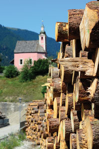 Trunks cut in a sawmill near Brunico (BZ) with a Church on background, Val Pusteria, South Tyrol, Italy